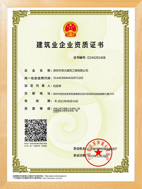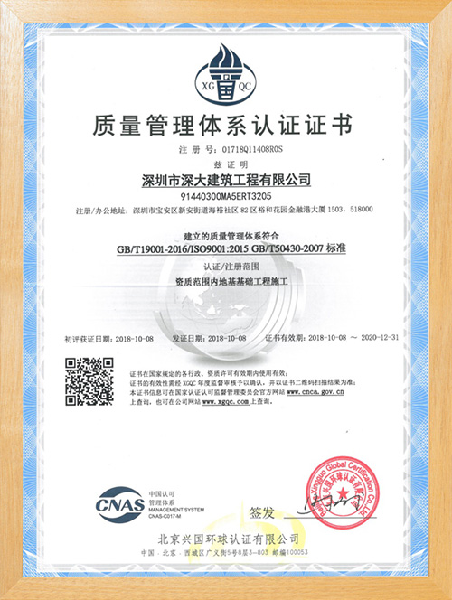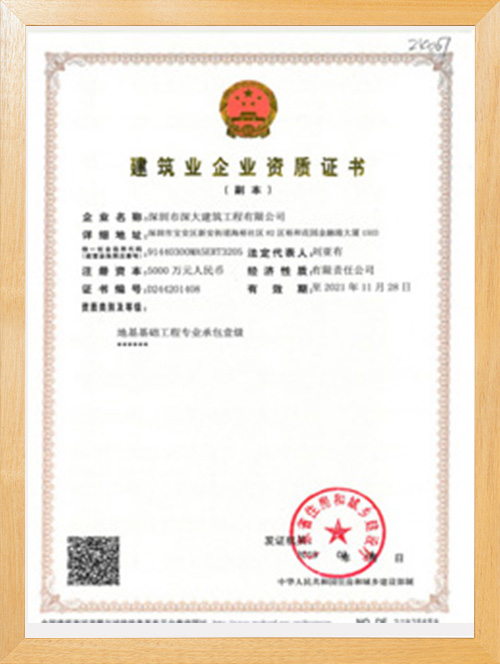 深圳市深大建筑工程有限公司,成立于2017年,注冊資本5000萬,總部位于深圳市寶安區(qū)中心地段。公司擁有地基基礎(chǔ)工程專業(yè)承包壹級資質(zhì),市政公用工程施工總承包二級資質(zhì),是一家一體化現(xiàn)代型企業(yè)。公司重視企業(yè)內(nèi)部管理與發(fā)展,嚴格實施ISO管理體系,率先通過了ISO9001質(zhì)量管理體系認證、環(huán)境管理體系及、職業(yè)健康安全管理體系的認證。為公司的長遠發(fā)展奠定了穩(wěn)健基礎(chǔ)。